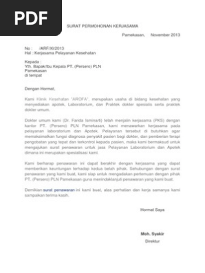Contoh surat pengajuan kerjasama. Contoh surat pengajuan dalam dunia kerja surat pengajuan terbilang sangat sering dipergunakan. Surat penawaran merupakan salah satu contoh dari surat resmi mengapa. Penawaran suatu barang jasa bahkan kerjasama dengan pihak lain akan lebih baik jika menggunakan surat penawaran. Contoh surat penawaran dewasa ini surat penawaran menjadi salah satu hal penting utama dalam hal perdagangan. Surat permohonan kerjasama format dan contoh surat kerjasama kegiatan produk surat permohonan kerjasama merupakan sebuah surat resmi yang dibuat untuk menawarkan sebuah permintaan atau permohonan kerjasama kepada seseorang atau perusahaan agar mereka mau menerima tawaran yang kita berikan. Pengajuan atau permohonan bisa dibuat oleh bawahan kepada pimpinan ataupun antar instansi dan kantor.