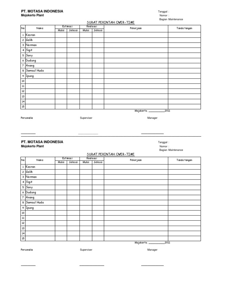 Xyz sebanyak 500 unit. Dwi apriyanto jabatan. Karena adanya keterlibatan 2 pihak maka surat ini masuk kedalam surat resmi sehingga. Maka untuk itu perlu diadakan kerja lembur oleh seseorang karyawan ataupun beberapa orang karyawan dan atasan bisa memberikan surat perintah kerja lembur kepada karyawan tersebut. Published 2033 by p form lembur. Contoh surat perintah kerja lembur pada saat saat tertentu sebuah perusahaan mungkin akan membutuhkan tenaga esktra untuk menyelesaikan pekerjaan yang bertumpuk.