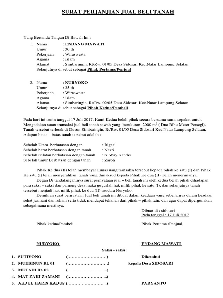 Surat perjanjian jual beli tanah sawah. Kami yang bertanda tangan di bawah ini. Membuat surat keterangan jual beli memang menjadi keharusan jika kita akan melakukan transaksi. Contoh surat jual beli tanah menulis surat jual beli tanah ialah untuk dua atau lebih pihak yang terlibat dalam transaksi tanah untuk menyusun rincian perjanjian dalam pembelian dan penjualan tanah yang juga dikenal sebagai perjanjian pembelian. Untuk selanjutnya disebut pihak ke i penjual. Pada artikel sebelumnya kita telah membahas mengenai surat perjanjian jual beli rumah sederhanapada artikel contoh surat perjanjian jual beli tanah terbaru kali ini kita akan membahas mengenai topik yang hampir sama.