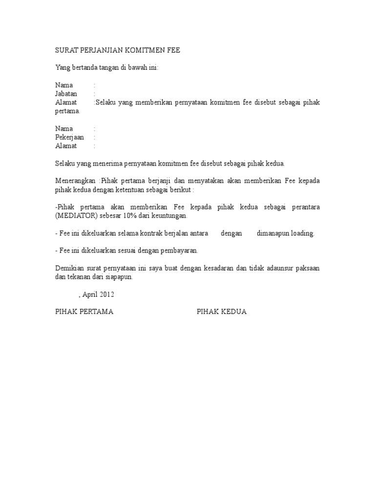 Untuk memperkuat pelaksanaan pemberian insentif atau fee tersebut perlu adanya kekuatan hukum yang mengikat. Demikian surat perjanjian jasa perantara tersebut mudah mudahan bermanfaatadapun yg saya tulis hanya ingin berbagi pengalaman saja dengan tidak bermaksud menjatuhkan pihak pihak tertentu dan tidak untuk bermaksud menggiring opini masyarakat tapi hendaknya keberadaan kami lebih dilihat dari nilai posaitifnya dengan tidak mengurangi rasa kehati hatian masyarakat dengan memilah milah broker yg. Contoh surat perjanjian kerjasama pembagian fee. Contoh surat perjanjian komitmen fee. Contoh surat perjanjian fee mediator release contoh surat perjanjian fee mediator personality contoh surat perjanjian fee mediator certification contoh surat perjanjian fee mediator law contoh surat perjanjian komitmen fee contoh surat perjanjian pembagian fee contoh surat perjanjian kerjasama contoh surat perjanjian jual beli tanah contoh surat perjanjian hutang piutang contoh surat. Surat perjanjian komitmen fee.