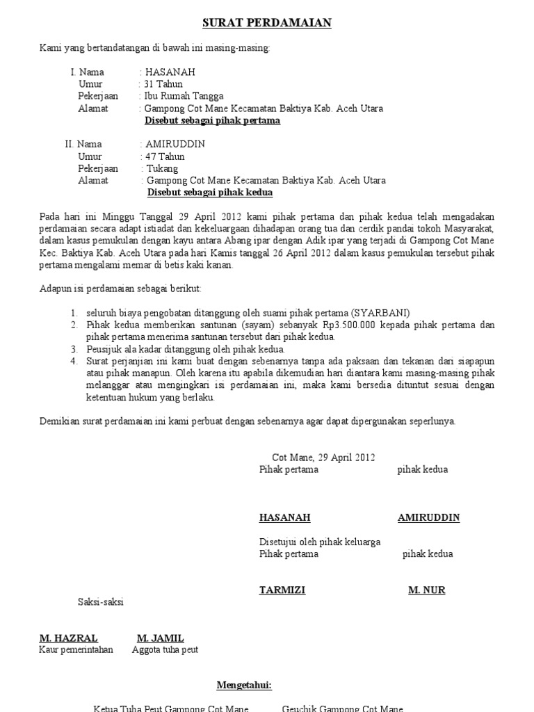 Semoga surat perjanjian perdamaian ini dapat digunakan sebagaimana semestinya. Silahkan disimak contoh surat perjanjian damai berikut ini. Kami pihak pertama dan pihak kedua berjanji dan sepakat mengakhiri perselisian kami dan saling memaafkan dengan mentaati pernyataan kami sebagaimana yang tersebut pada poin 1 sampai poin ke 5. Namun akan terasa sulit jika kita belum pernah membuat surat perjanjian damai tersebut. Contoh surat perjanjian pastinya anda paham betul jika ada 2 instansi melakukan kerja sama dan sudah menemukan titik kesepakatan maka umumnya akan ada surat perjanjian maupun jaminan untuk sebuah kepastian. Contoh draft perjanjian perdamaian perjanjian perdamaian perdamaian ini dibuat pada hari ini senin tanggal 17 tujuh belas bulan 3 tiga tahun 2014 dua ribu empat belas antara pihak pihak yang disebutkan dibawah ini.