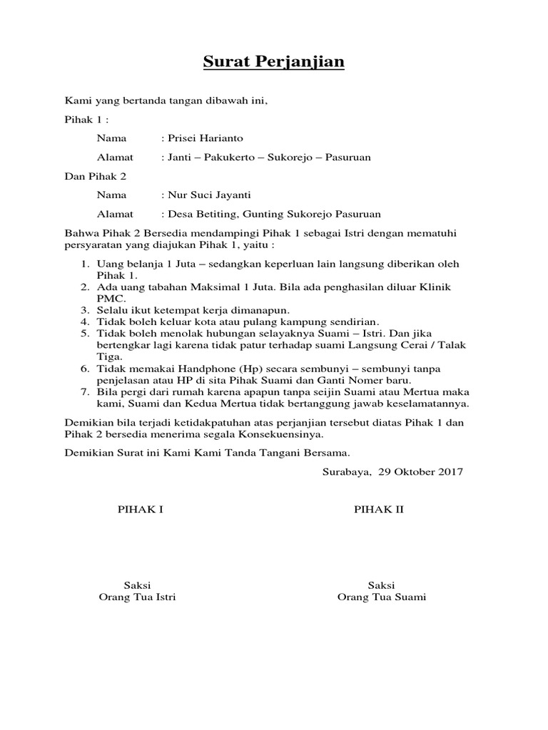 Berikut ini contoh surat pernyataan persetujuan istri pertama kepada suami untuk melangksungkan pernikahan kedua dengan orang lain atau lebih dikenal dengan izin berpoligami. Pihak pertama berjanji tidak akan mengulangi lagi. Pihak kedua nama umur pekerjaan. Surat untukmu puisi 4qz3opvrox0k. Raffi ahmad dan nagita membuat perjanjian pranikah kalau kamu. Ada banyak alasan yang mengharuskan sepasang suami istri untuk bercerai dan berpisah tergantung dari permasalahan keluarga masing masing.