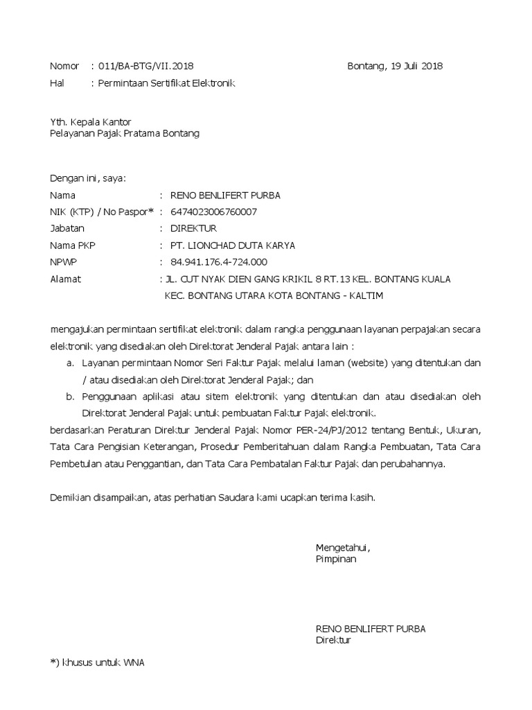 Contoh surat permintaan sertifikat elektronik. Surat permintaan sertifikat elektronik dan surat pernyataan persetujuan penggunaan sertifikat elektronik ditandatangani dan disampaikan oleh pengurus pkp yang bersangkutan secara langsung ke kpp tempat pkp dikukuhkan dan tidak diperkenankan untuk dikuasakan ke pihak lain. Dan tidak diperkenankan untuk dikuasakan ke pihak lain. Pengurus sebagaimana dimaksud disini adalah. Download surat permintaan sertifikat elektronik pajak word. Pkp mengajukan permohonan berupa surat permintaan sertifikat elektronik dan surat pernyataan persetujuan penggunaan sertifikat elektronik ditandatangani dan disampaikan oleh pengurus pkp yang bersangkutan secara langsung ke kpp tempat pkp dikukuhkan. Surat permintaan sertifikat elektronik dan surat pernyataan persetujuan penggunaan sertifikat elektronik ditandatangani dan disampaikan oleh pengurus pkp yang bersangkutan secara langsung ke kpp tempat pkp dikukuhkan dan tidak diperkenankan untuk dikuasakan ke pihak lain.