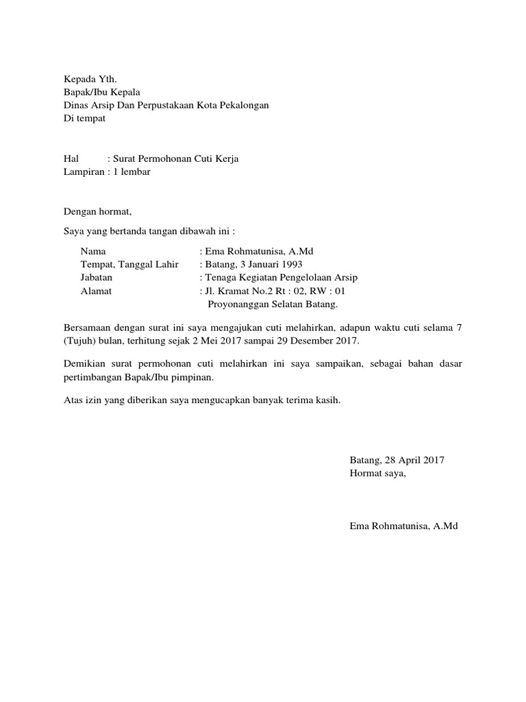 Walaupun surat surat cuti ini biasa digunakan dilingkungan pegawai negeri sipil tidak menutup kemungkinan juga koq untuk digunakan di perusahaan swasta. Surat permohonan cuti kerja lampiran. Sleman 25 juni 1990 jabatan posisi. Dengan ini mengajukan permohonan cuti melahirkan adapun waktunya selama kurang lebih tiga bulan 3 bulan terhitung mulai sepuluh januari 10 januari 2011 sampai sepuluh april 10 april 2011. Maju jaya perkasa di tempat. 15 contoh surat permohonan cuti paling lengkap jika anda seorang karyawan perusahaan pegawai negeri sipil atau bahkan mahasiswa tentunya tidak asing lagi dengan surat cuti.