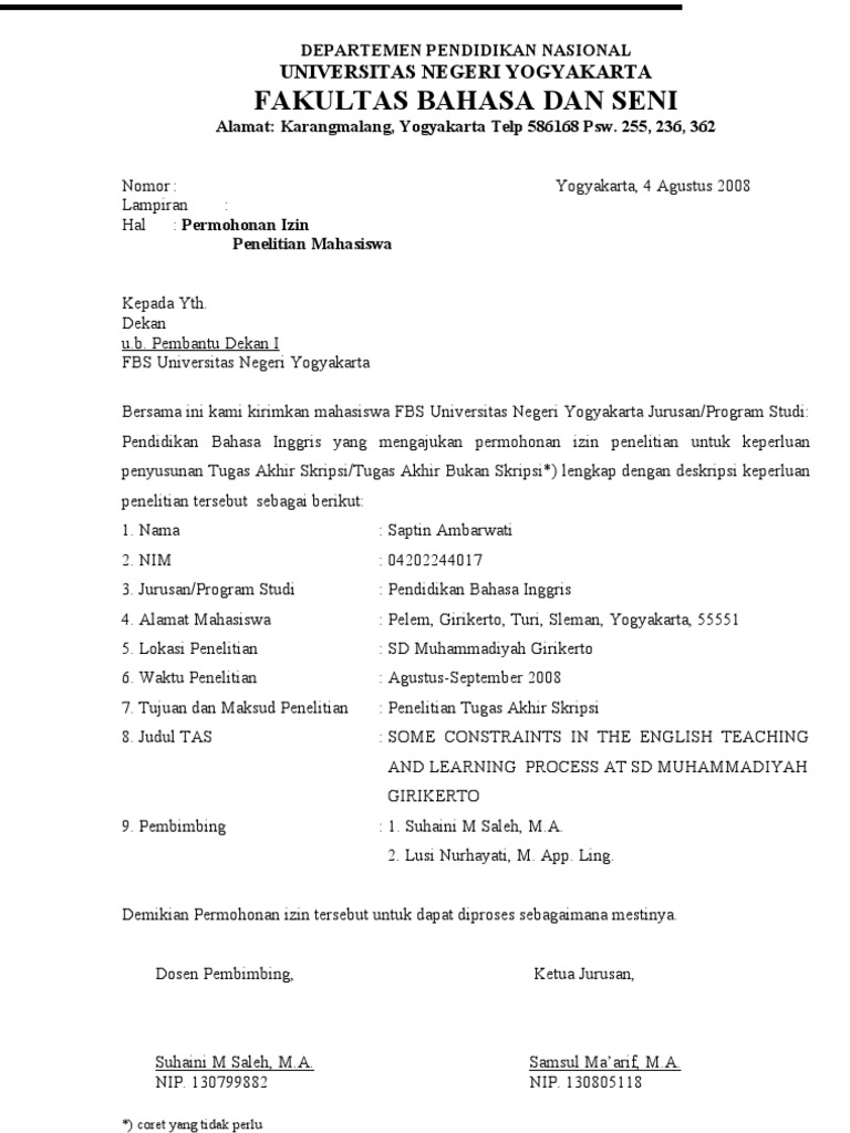 Demikian surat permohonan ijin penelitian ini saya ajukan atas perhatian bapak saya mengucapkan terima kasih. Contoh surat permohonan ijin penelitian yogyakarta 02 januari 2017 nomor. Surat permohonan ini dibuat oleh pihak universitaskampus jika lingkup kampus yang luas surat ini akan dikeluarkan oleh bagian jurusanprogram studi namun pada kasus kasus tertentu surat ini sikeluarkan oleh bagian. Tapi sebelum itu kami memberikan informasi bahwa disini kami setiap harinya membahas contoh surat. Surat permohonan untuk skripsi atau tugas akhir memang sangat di perlukan dengan tujuan dan maksud untuk melakukan suatu skripsi yang dimana menjadi salah satu penentu sebagai kelulusan mahasiswa dengan kata lain wisuda. Untuk mendapatkan izin tempat penelitian terlebih dahulu pihak universitas melalui fakultas terkait mengirimkan surat permohonan izin penelitian kepada pihak yang dituju.