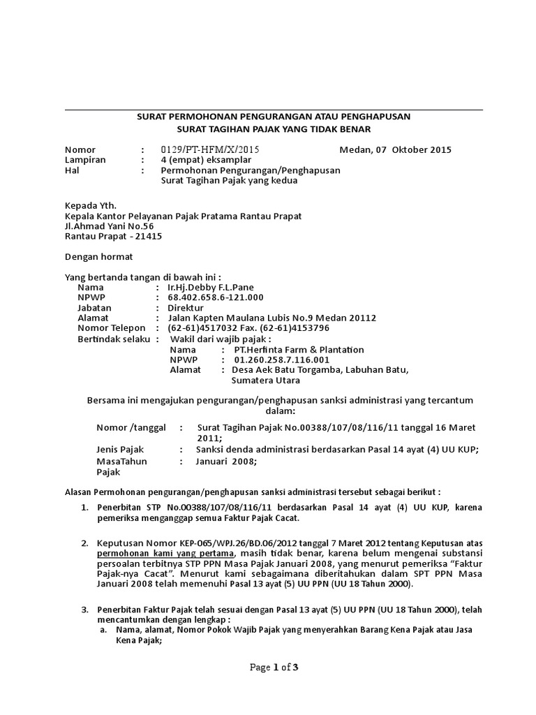 Contoh surat permohonan penghapusan sanksi pajak. Surat permohonan penghapusan denda pajak. Pt abc merupakan pkp yang telah dikukuhkan pada tanggal 21 januari 2017. Contoh surat permohonan penghapusan sanksi denda pajak daerah menggunakan format forum pajak dapat kamu unduh secara gratis dan lengkap disini. Berikut ini syarat syarat mengajukan permohonan penghapusan sanksi administrasi sesuai pmk nomor 91pmk032015. Berikut ini administrasi perpajakan pt abc terkait pelanggarannya. Permohonan dapat diajukan oleh wajib pajak paling banyak 2 dua kali.