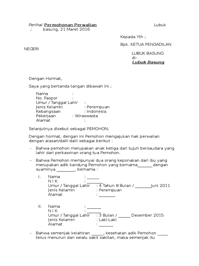 Sebagaimana halnya gugatan permohonan juga mempunyai beberapa syarat formil yang didalamnya harus memenuhi. Kali ini saya akan memberikan contoh surat permohonan perwalian di pengadilan negeri bagi awam. Berikut dokumen nya silahkan download. Surat proposal tugas atau keterangan dan lain lain ini hanyalah panduan dan contoh semata semua isi dan inti dari surat tersebut nanti silahkan sesuaikan dengan kebutuhan anda kami tidak bertanggung jawab apabila nanti ada permasalahan yang muncul di karenakan anda mengambil contoh dari blog ini. Contoh surat permohonan perwalian anak di bawah umur contoh surat permohonan perwalian anak di bawah umur untuk melakukan pengawasan tersebut pastinya dilakukan oleh orang yang telah dewasa yang telah ditunjukan oleh undang undang atau telah ditunjuk oleh keluarga si anak persyaratan mengajukan surat permohonan perwalian anak. Seorang suami sebut saja a meninggal dunia dan meninggalkan seorang istri sebut saja b beserta empat orang anak semuanya masih di bawah 15 tahun.