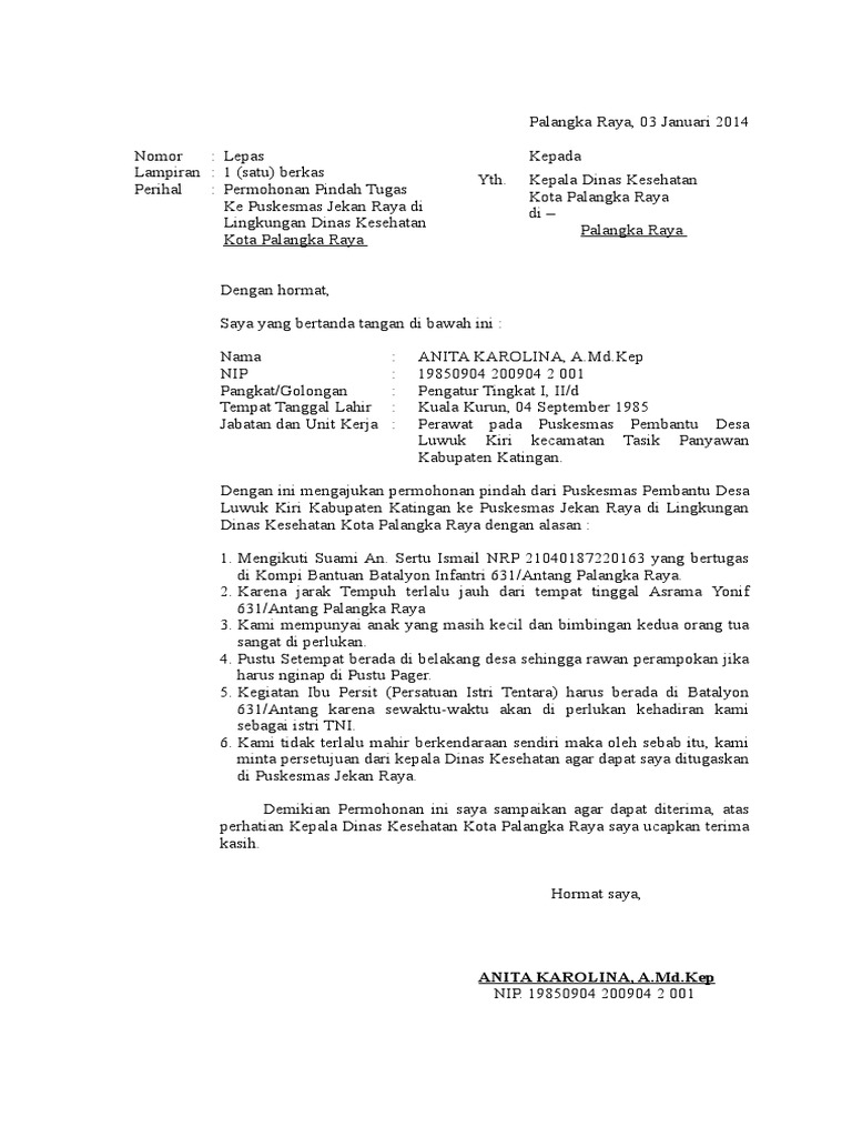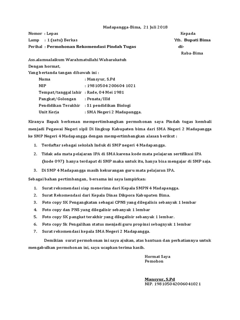 Contoh surat permohonan pindah tugas pns. 1fotocopy surat keputusan sk 2fotocopy sk cpnspns jika anda berprofesi sebagai pns 3fotocopy kartu pegawai. Tarif dasar listrik tdl adalah tarif harga jual listrik yang dikenakan oleh pemerintah untuk para pelanggan pln. Contoh surat permohonan pindah tugas by yogaabie in types articles news stories surat permohonan dan permohonan. Contoh surat permohonan mutasi pindah tugas pns pada kesempatan ini akan mendistribusikan contoh surat lamaran tepatnya contoh surat permohonan mutasi kerja surat aplikasi mutasi ini berlaku untuk kepentingan umum pegawai negeri pegawai bank guru dan pegawai swasta. Dalam surat permohonan pindah tugas harus dicantumkan alasan meminta pindah tugas dari salah satu sekolah ke sekolah yang lain dan selain surat permohonan pindah tugas guru tersebut juga harus melampirkan surat keterangan bersedia melepas guru yang ingin pindah oleh sekolah tempat guru tersebut mengajar sebelumnya dan juga surat rekomendasi dari upt pendidikan wilayah tempat yang guru yang.