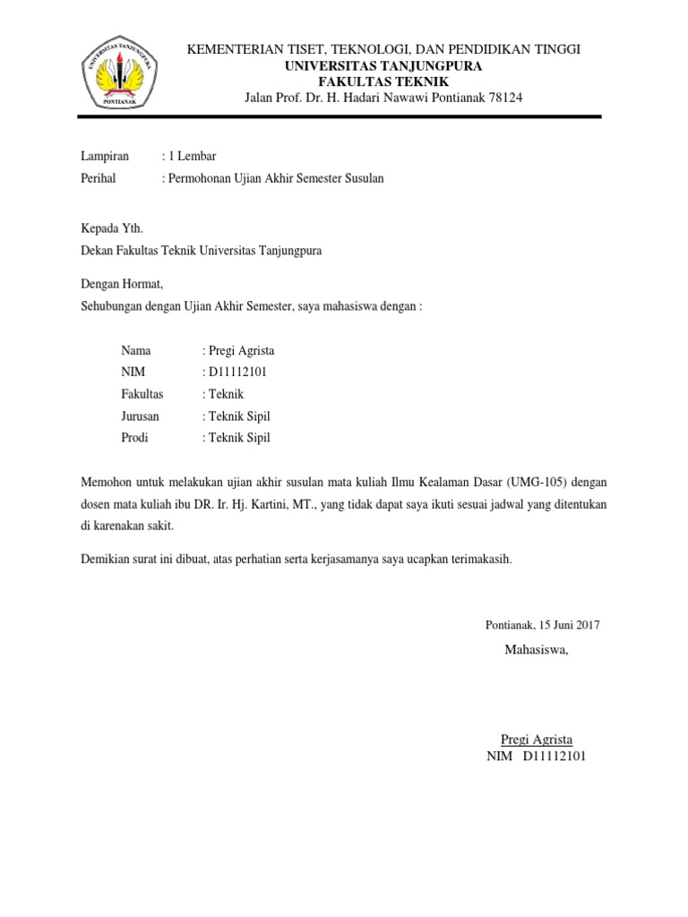 Anda bisa menggunakan contoh contoh surat permohanan ini untuk memohon bantuan permohonan izin permohonan dana permohonan kerjasama permohonan magang hingga untuk permohonan maaf. Kaprodi bapak abdul rahman saleh st msc. Contoh surat permohonan ujian susulan kuliah. Contoh surat permohonan ujian susulan banyak sekali faktor yang membuat kita untuk tidak bisa menghadiri saat saat penting salah satu hal penting yang kadang kali sering terhambat adalah tidak dapat mengikuti utsuas di kampus terdapat beberapa alasan yang sering kali muncul dan khususnya untuk yang kuliah sambil kerja kadang ada saja hal hal yang bisa membuat kita tidak bisa ikut. Namun terkadang ada saja yang menciptakan kita tidak dapat mengikuti ujian semisal sakit. Contoh surat permohonan ujian susulan selasa 14 mei 2013.
