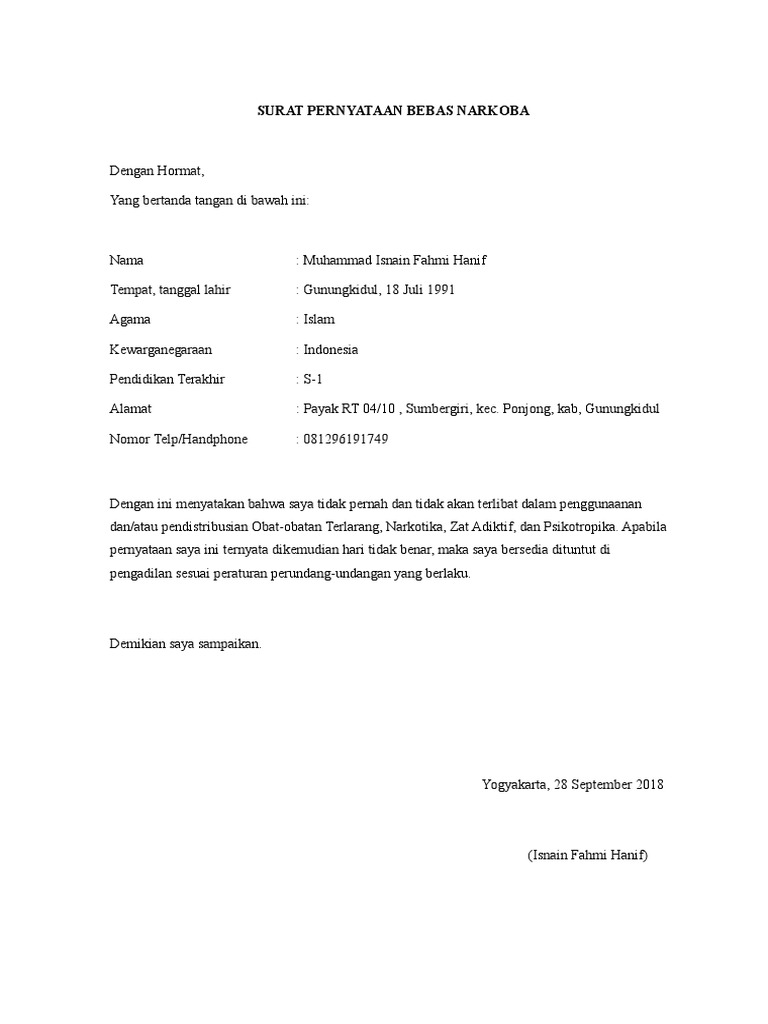 Contoh surat pernyataan bebas narkoba. Contoh surat pernyataan bebas narkoba wwwsuratresmiid. Contoh surat pernyataan bebas narkoba. Bantul 14 agustus. Surat pernyataan bebas narkoba juga dapat dibuat oleh diri sendiri. Surat pernyataan yang bertanda tangan dibawah ini. Surat lamaran dan surat pernyataan ini merupakan salah satu syarat yang harus di sertakan oleh peserta seleksi cpns tahun 2018.