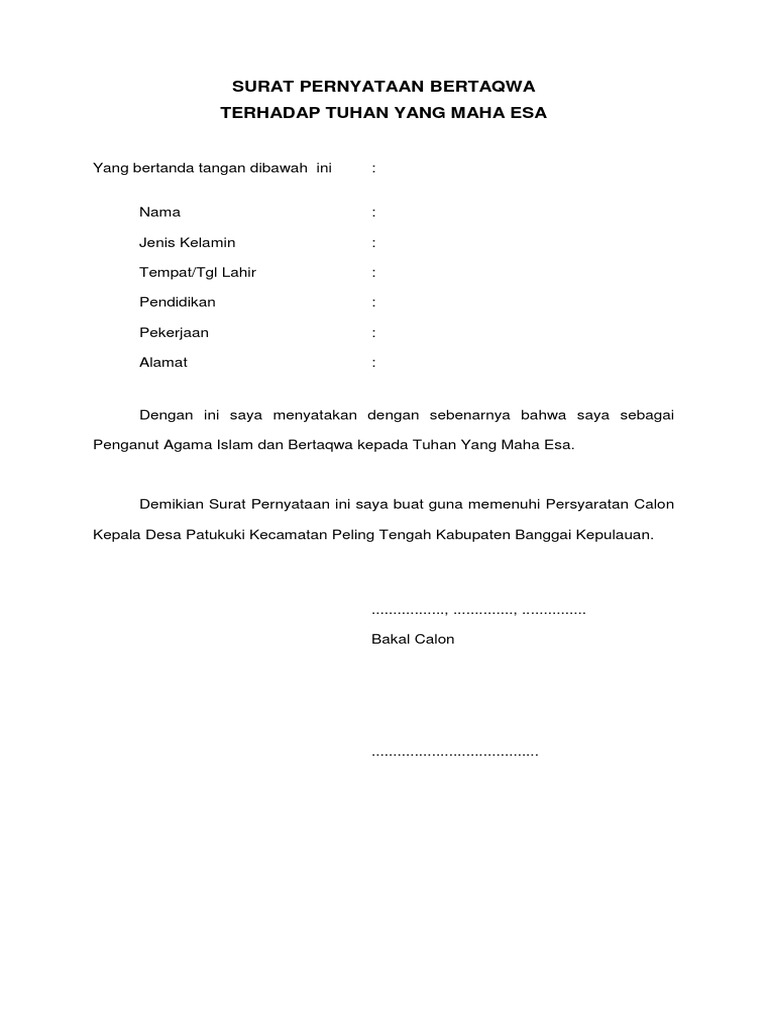 Contoh surat pernyataan bertaqwa kepada tuhan yang maha esa. Khususnya bagi anda yang membutuhkan surat pernyataan itu dalam konteks persyaratan pilkades maupun persyaratan administrasi di bidang lainnya. Semoga contoh surat ini bermanfaat. Berikut ini contoh surat pernyataan beriman dan bertaqwa kepada tuhan yang maha esa dengan memeluk dan menjalankan ajaransyariat agama islam sebagai salah satu syarat berkas calon kepala kampung atau perangkat desa. Demikian ulasan contoh surat pernyataan bertaqwa kepada tuhan yang maha esa yme calon kepala desasemoga contoh format surat pernyataan tersebut dapat bermanfaat untuk anda semua. Contoh surat setia kepada pancasila uud 1945 dan negara kesatuan republik indonesia. Contoh format surat pernyataan bertaqwa kepada tuhan yang maha esa.
