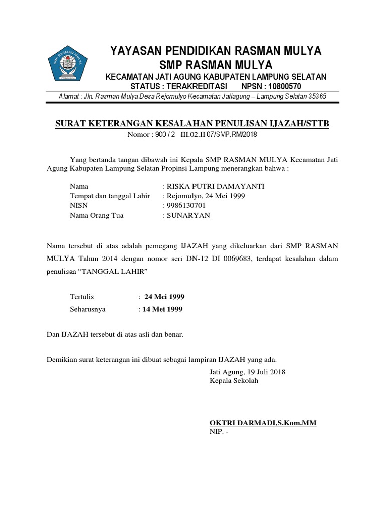 Mrngalah lah saya karena mmg kesalahannya berada di ijazah saya nama ayah jadi saya sekarang berada dalam tahap meminta surat krterangan kesalahan penulisan ijazah di sd smp sma. Pastikan juga bahwa surat keterangan beda tanggal lahir dan nama tersebut ditandatangani oleh kepala desa dan saksi. Format surat keterangan kesalahan penulisan ijazah ini bisa kita gunakan baik di sd smp smk atau sederajat. Tapi di ijazah saya nama ayah saya hanya ahmad. Bagi sebagian orang hal seperti ini kadang tidak begitu diperhatikan tapi belakangan saat mereka menggunakan dokumen dokumen tersebut baru terasa seperti apa permasalahannya. Hal ini untuk menghindari hal hal yang tidak diinginkan di kemudian hari.