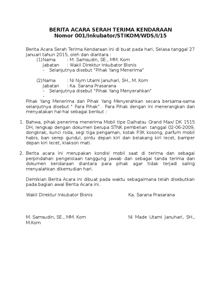 Contoh surat serah terima dokumen word. Halo sobat nehanesia apakah anda sedang mencari contoh surat berita acara serah terima barang. Penyertaan surat ini dalam sebuah kegiatan dimaksudkan untuk mengetahui runtutan kejadian yang berlangsung. Ataukah anda masih bingung bagaimana membuat surat serah terima barang nah kebetulan saya ada contohnya nih mudah mudahan contoh dari saya ini dapat sobat jadikan referensi. 4 bahwa dengan telah dilakukannya serah terima dokumen tersebut sebagaimana dimaksud butir 3 diatas maka kewajiban pihak pertama untuk menyerahkan dokumen kepada pihak kedua dan hak pihak kedua untuk menerima dokumen tersebut dari pihak pertama telah dilaksanakan. Jenis surat ini sudah digunakan luas oleh berbagai kalangan seperti halnya digunakan sebagai surat serah terima barang atau surat serah terima pekerjaan. Surat ini dapat digunakan luas oleh beberapa kalangan seperti halnya digunakan sebagai surat serah terima dokumen surat serah terima barang dan juga surat serah pekerjaan.