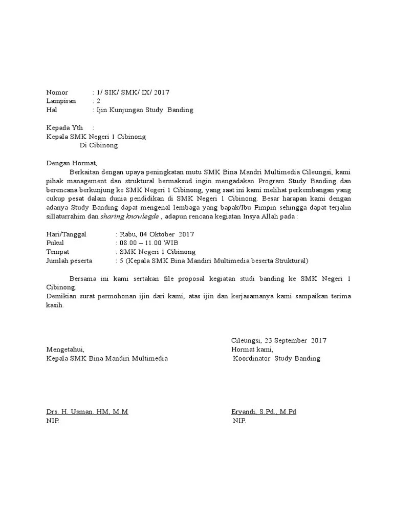 Contoh surat izin melaksanakan study banding contoh surat izin melaksanakan study banding yang ditujukan kepada kepala instansi berbeda untuk dapat memberikan izin kepada pegawai yang akan melaksanakan study banding. Dengan program kerja perpustakaan sma negeri 1 manyar gresik tahun pelajaran 2013 2014 yang tertuang dalam kegiatan studi banding. Sma negeri 1 manyar. Unknown lihat profil lengkapku. Admin blog kumpulan surat penting juga mengumpulkan gambar gambar lainnya terkait contoh surat permohonan kunjungan studi banding ke sekolah dibawah ini. Contoh surat balasan peminjaman.