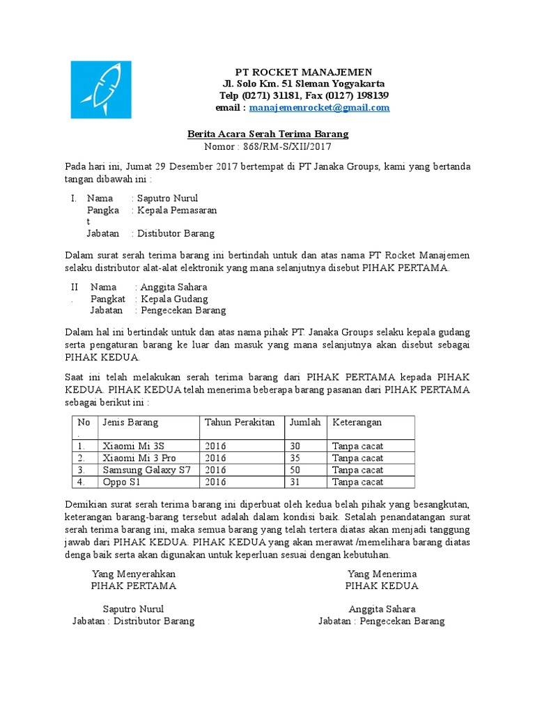 Contoh surat serah terima barang dalam kegiatan perpindahan barang tentu saja memerlukan sebuah bukti sah yang dapat dipertanggung jawabkan ke depannya seperti surat serah terima barang. Berita acara serah terima barang merupakan salah satu dokumen penyerahan barang yang cukup penting. Namun biasanya tanda terima dipergunakan ketika pengiriman barang atau dokumen sebagai bukti bahwa barang yang telah dikirim tersebut sudah diterima.