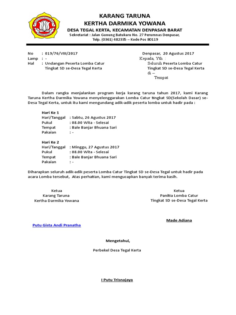 Yudhista aditya created date. Apakah kalian sering mengikuti lomba ketika berada. Contoh surat undangan pemberitahuan lomba sekolah ada dua jenis yaitu untuk memberitahukan lomba pada seluruh siswa dan ada juga surat untuk memberitahukan kepada sekolah lain yang ingin berpartisipasi terhadap lomba tersebut. 8102012 52418 pmundangan lomba penulisan essay dan lomba menggambarmewarnai. Contoh surat undangan ikut lomba invitation letter dalam bahasa inggris dan artinya invitation letter for competition hai sahabat kbi. Kamu akan membutuhkan surat rekomendasi atau surat izin dari pihak sekolah untuk mengikuti kegiatan lomba tersebut.