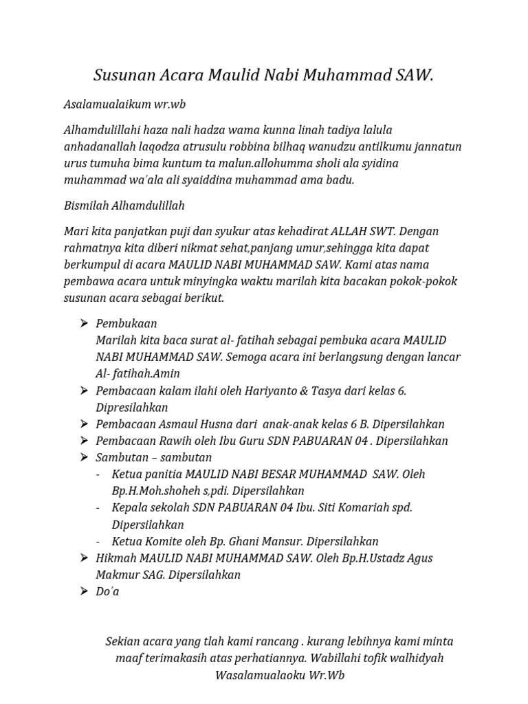 Berikut teks atau naskah pembawa acara maulid nabi muhammad dibawah ini. Susunan acara peringatan maulid nabi muhammad saw. Pada pagi ini kita semua memperingati maulid nabi muhammad saw. Berikut ini adalah contoh kecil dari susunan acara maulid nabi muhammad saw. Baiklah bapakibu dan teman teman semua sebelum acara dimulai terlebih dahulu saya bacakan susunan acara pada pagi ini adapun susunan acara maulid nabi muhammad saw sebagai berikut. Dengan tanpa ada.