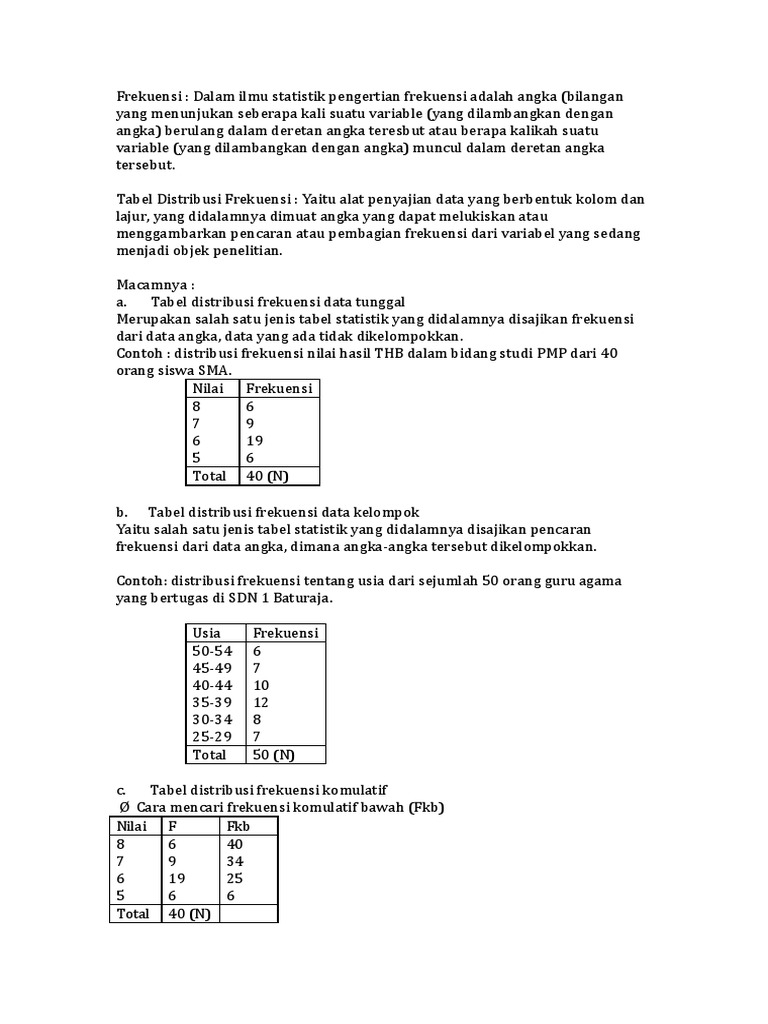 Tabel 2b merupakan daftar frekuensi dari data yang sudah dikelompokkan. Selanjutnya data tersebut disajikan dalam daftar distribusi frekuensi seperti tabel berikut. Distribusi frekuensi kumulatif tabel distribusi kumulatif ada dua macam yaitu. Kita sering kali mengelompokkan data contoh ke dalam selang selang tertentu agar memperoleh gambaran yang lebih baik mengenai karakteristik dari suatu data. Contoh tabel distribusi frekuensi 50 data. Contoh tabel distribusi frekuensi tunggal.