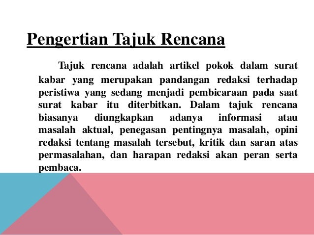 Judul tajuk rencana yang menarik juga akan memberikan kesan yang mudah diingat oleh pembaca itu. Tajuk rencana pengertian ciri fungsi materi jenis struktur cara contoh untuk kali ini kami akan bagi materi bahasa indonesia mengenai tajuk rencana yang dalam hal meliputi seperti pengertian ciri fungsi materi jenis struktur cara dan contoh kalau begitu simaka saja uraian dibawah ini.