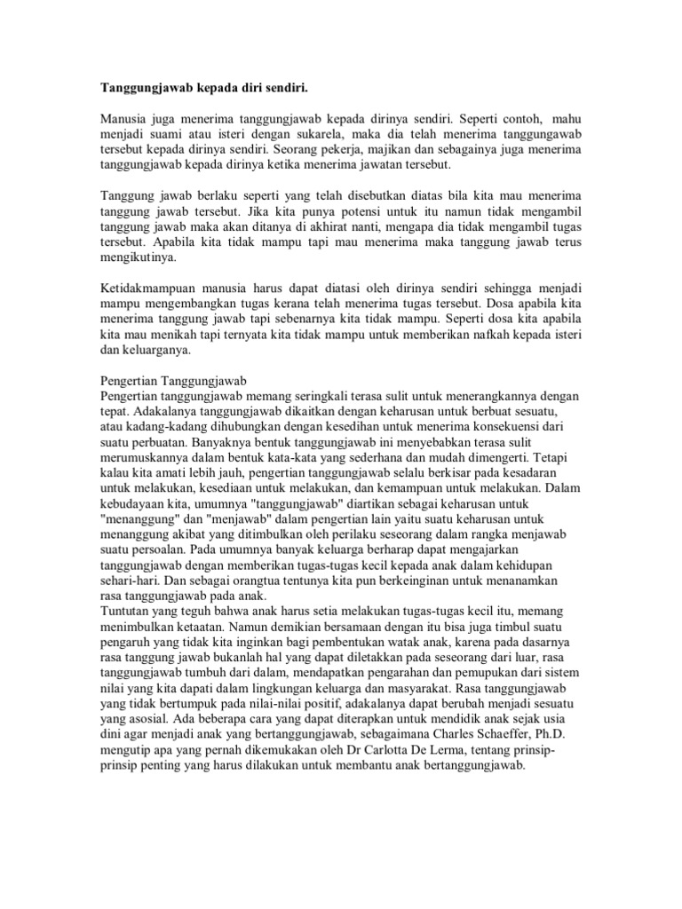 Tanggung jawab terhadap diri sendiri. Dengan demikian bisa memevahkan masalah masalah kemanusiaan mengenai dirinya sendiri menurur sifat dasarnya manusia adalah mahluk bermoral tetapi manusia juga pribadi. Selain tanggung jawab terhadap diri sendiri kamu juga harus bertanggung jawab di lingkungan keluarga. Memiliki rasa tanggung jawab terhadap segala pekerjaan atau terhadap orangtua anak suami istridll adalah hal yang baik. Tanggung jawab terhadap diri sendiri menentukan kesadaran setiap orang untuk memenuhi kewajibannya sendiri dalam mengembangkan kepribadian sebagai manusia pribadi. Menjaga sikapperilaku diri menjauhkan diri dari free sex belajar dengan sungguh sungguh 2.