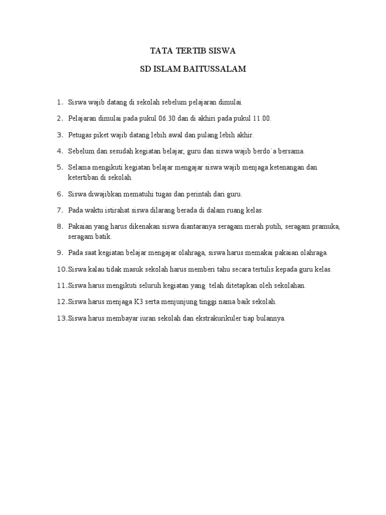 30 contoh tata tertib sekolah sd smp sma. Tertib masuk kelas 1. Berikut adalah contoh tata tertib sekolah secara umum yang biasa diterapkan untuk siswa pada lingkungan sekolah menengah pertama dan sekolah menengah atas. Baik di dalam lingkungan keluarga contoh lingkungan sekolah masyarakat maupun berbangsa dan bernegaratata tertib hampir sama seperti hukum yang mengatur segala tingkah laku perbuatan manusia dalam lingkungannya. Para siswa sudah hadir di sekolah 10 menit sebelum mata pelajaran pertama di mulai. Bahwa dalam rangka pelaksanaan peraturan pemerintah nomor 19 tahun 2007 tentang standar pengelolaan pendidikan oleh satuan pendidikan dasar dan menengah perlu menetapkan peraturan sekolah tentang tata tertib peserta didik.