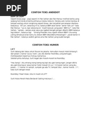 Contoh teks anekdot dan humor. Anekdot merupakan teks yang berniat di buat dengan berbentuk humor atau dengan penyampaian dengan bentuk humor. Jika membahas tentang anekdot tentu akan kurang rasanya jika anda tidak memahami ciri ciri struktur dan kaidah dari anekdot itu sendiri. Hal ini diperkeruh dengan keberadaan teks yang lebih tepat disebut sebagai cerita humor namun oleh penulisnya diberi label anekdot begitu pula sebaliknya. Contoh dan kaidahnya semoga dengan adanya ulasan tersebut dapat menambah wawasan dan pengetahuan anda semua terima kasih banyak atas kunjungannya. Contoh 1 teks humor jantung berdebar debar. Contoh teks anekdot lucu dan menyindir.