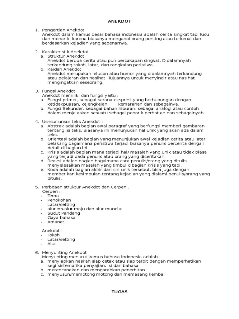 Nah itu pengertian teks cerita anekdot. Dalam lelucon yangmenyenangkan terdapat rasa kepuasan senyum. Teks anekdot merupakan cerita singkat biasanya lucu dan bersifat sindiran atau bahkan kritikan. Teks anekdot adalah sebuah cerita singkat dan lucu atau menarik yang mungkin menggambarkan kejadian atau orang sebenarnyafungsi utama teks anekdot untuk menyindir atau mengkritik. Anekdot merupakan cerita singkat yang di dalamnya mengandung unsur menyindir yang bersifat lucu atau humor. Daftar isiciri ciri teks anekdotstruktur teks anekdotkaidah.