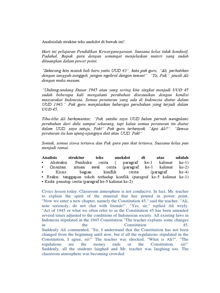 Berikut ini adalah contoh teks anekdot pendidikan. Yang bisa jadi menggambarkan kejadian sebenarnya. Abstraksi bagian ini terletak pada bagian awal paragraf pada bagian ini berisikan gamabaran awal tentang isi dari teks anekdot. Pendidikan adalah senjata paling ampuh karena dengann pendidikan mampu mengubah dunia. Daftar isiciri ciri teks anekdotstruktur teks anekdotkaidah. Contoh teks anekdot pernahkah anda mendengar istilah teks anekdot.