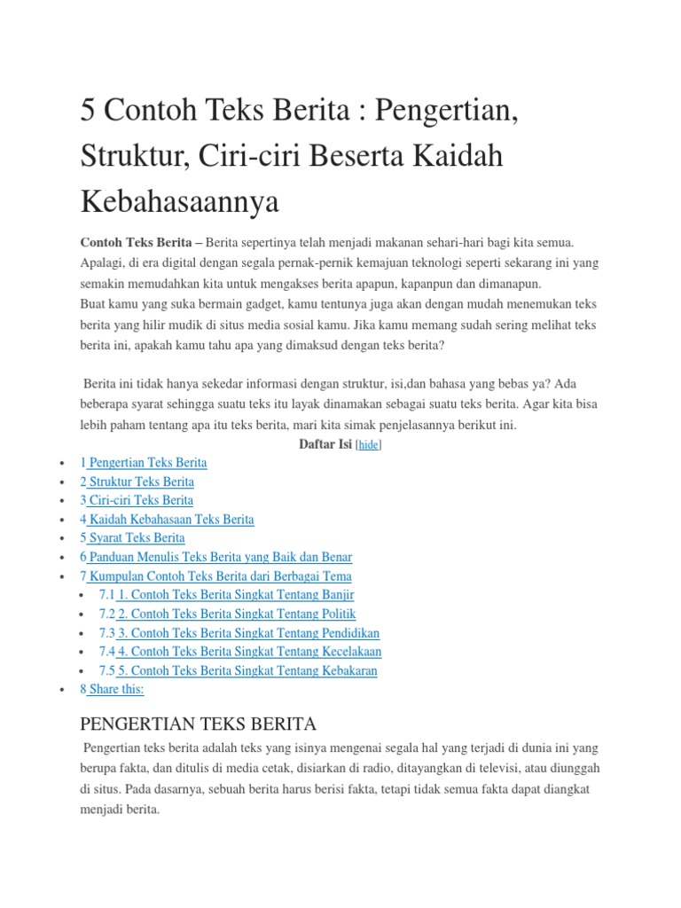 Contoh teks berita singkat di televisi. Contoh teks berita berita sepertinya telah menjadi makanan sehari hari bagi kita semuaapalagi di era digital dengan segala pernak pernik kemajuan teknologi seperti sekarang ini yang semakin memudahkan kita untuk mengakses berita apapun kapanpun dan dimanapun. Sebuah berita yang kita nikmati setiap hari tidak terlepas dengan naskah berita televisi yang pada mulanya disusun terlebih dahulu untuk kemudian dibacakan. Anak anak sd di desa mekar jaya kabupaten muara enim jika pasca turun hujan harus berjuang lebih keras dalam menuntut ilmu mereka harus berjalan kaki tanpa menggunakan sepatu dalam kondisi lumpur dan becek dengan jarak tempuh mencapai 5 km untuk belajar di sekolah dan menggapai cita cita mereka. Teks berita adalah teks yang melaporkan kejadian peristiwa atau infomasi mengenai sesuatu yang telah atau sedang terjadi. Contoh teks berita mirip seperti di acara berita 5w 1h setiap harinya pasti kita melihat televisi dan berbagai macam acara di dalamnya pasti kalian pernah melihat acara di televisi baik itu berita sinetron ataupun film kartun. Apalagi di era digital dengan segala pernak pernik kemajuan teknologi seperti sekarang ini yang semakin memudahkan kita untuk mengakses berita apapun kapanpun dan di manapun.