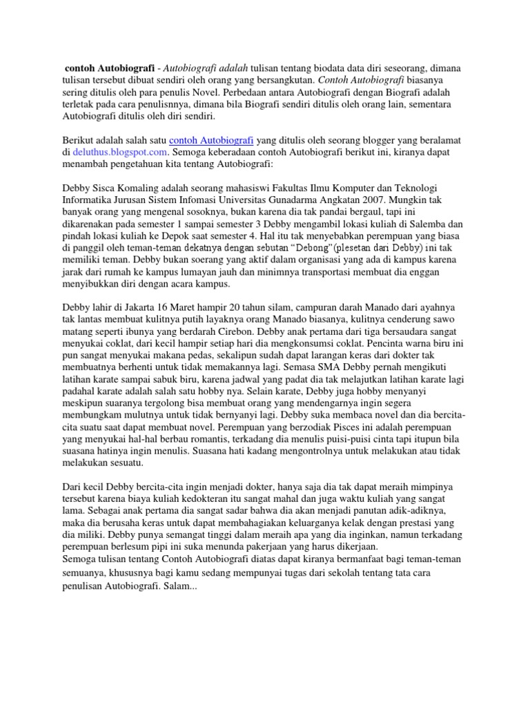 Contoh teks biografi diri sendiri. Teks biografi ditulis oleh orang lain. Dalam penulisannya teks ini menggunakan sudut pandang. Contoh autobiografi autobiografi adalah tulisan tentang data diri seseorang di mana tulisan tersebut di buat sendiri oleh yang bersangkutanjika ing melihat contoh autobiografi lihat saja novel biasanya penulis novel akan menuliskan autobiografinya. Di bawah ini merupakan contoh biografi yang membahas tentang diri sendiri. Biografi diri sendiri atau biografi pribadi assalamualaikum wrwb para blogger yang terhormat pada kesempatan kali ini saya akan memposting tentang biografi pribadi contoh ini sebeumnya merupakan tugas kuliah saya. Contoh biografi diri sendiri berbeda dengan anggapan sebagian orang sebenarnya membuat sebuah biografi atau autobiografi tidaklah sesulit yang dibayangkan.