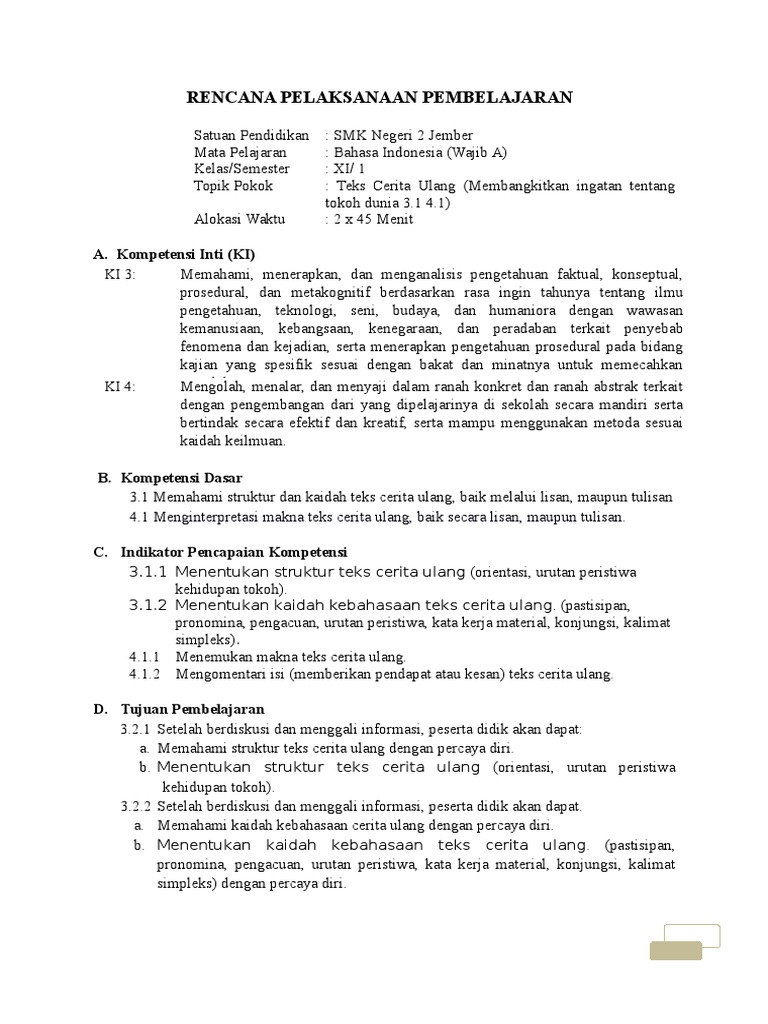 Teks cerita ulang recount adalah teks yang menceritakan kembali pengalaman masa lalu secara kronologis dengan tujuan memberi informasi atau menghibur pembaca atau bisa jadi keduanyacerita ulang terbagi atas 3 jenis yaitu rekon faktual informasional rekon imajinatif dan rekon pribadi. Tujuan komunikatif dari teks cerita ulang ialah melaporkan peristiwa suatu kejadian maupun kegiatan yang telah terjadi di masa lampau dalam suatu urutan secara kronologis guna menghibur ataupun memberi informasi untuk pembacanya. Pada hari pertama aku dan pada hari berikutnya aku dan pada hari terakhir aku. Struktur teks cerita ulang. Orientasi pengenalan yaitu memberikan informasi tentang siapa dimana dan kapan peristiwa atau kejadian terjadi di masa lampau. Teks ini menyerupai keadaan ketika anda menceritakan pengalaman yang baru saja anda rasakan pada orang lain.