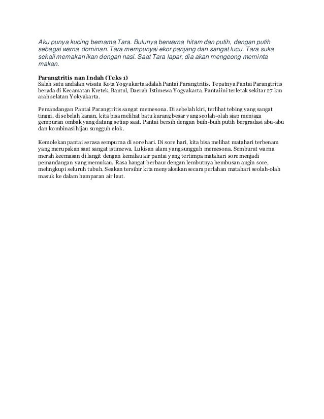 Contoh teks deskripsi dalam bahasa indonesia. Bulu halusnya tersebut menyelimuti tubuhnya mulai dari kepala sampai ke ekornya. Untuk pembahasan kali ini kami akan mengulas mengenai teks deskripsi yang dimana dalam hal ini meliputi contoh tujuan ciri struktur dan jenis nah agar dapat lebih memahami dan dimengerti simak ulasan. Contohtext kali ini memberikan teks deskripsi tentang hewan beberapa hewan yang ada pada descriptive text berikut yakni anjing kucing burung ikan dan kelinci. Contoh teks deskripsi terdapat berbagai jenis teks yang sering kita jumpai seperti narasi prosedur eksposisi laporan dan deskripsi. Salome mempunyai bulu yang begitu halus serta berwarna cokelat belang putih.