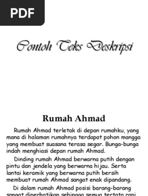 Contoh teks deskripsi tentang rumah. Contoh teks deskripsi. Untuk lebih memahaminya disini kita akan memberikan beberapa contoh agar anda tidak keliru serta dapat membedakannya terhadap jenis teks yang lainnya. Rumahku adalah rumah mungil di depan mushola. Teks deskripsi tentang tumbuhan. Aku memiliki pohon rambutan yang berada di belakang rumah pohon rambutan tersebut memiliki tinggi sekitar 3 meter dan sudah berbuah banyak. Jika aku ingin memakan rambutan aku tinggal memanjat pohon tersebut dan mengambil buah nya.