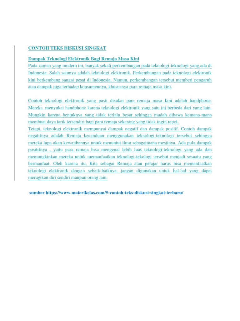 Namun pada kenyataannya sampai kini masih ditemukan penyalah gunaan narkoba. Contoh teks diskusi apa yang dimaksud dengan diskusipengertian diskusi menurut kamus ilmiah populer diartikan sebagai pembahasan bersama mengenai suatu masalah saling tukar pikiran bahas membahas tentang suatu hal. Dampak teknologi elektronik bagi remaja masa kini. Semuacontoh yoo para pembaca kali ini saya akan membagikan 3 contoh singkat teks diskusi tentang internet teknologi dan lingkungan beserta strukturnya yang merupakan salah satu materi pembelajaran bahasa indonesia yang mungkin teman teman butuhkan untuk mengerjakan tugasnah tanpa perlu banyak basa basi lagi simaklah beberapa contoh dari teks diskusi singkat dibawah ini. Contoh teks diskusi. Karena dianggap dapat memudahkan segala aktivitas smartphone akhhirnya digunakan banyak kalangan orang termasuk anak anak.