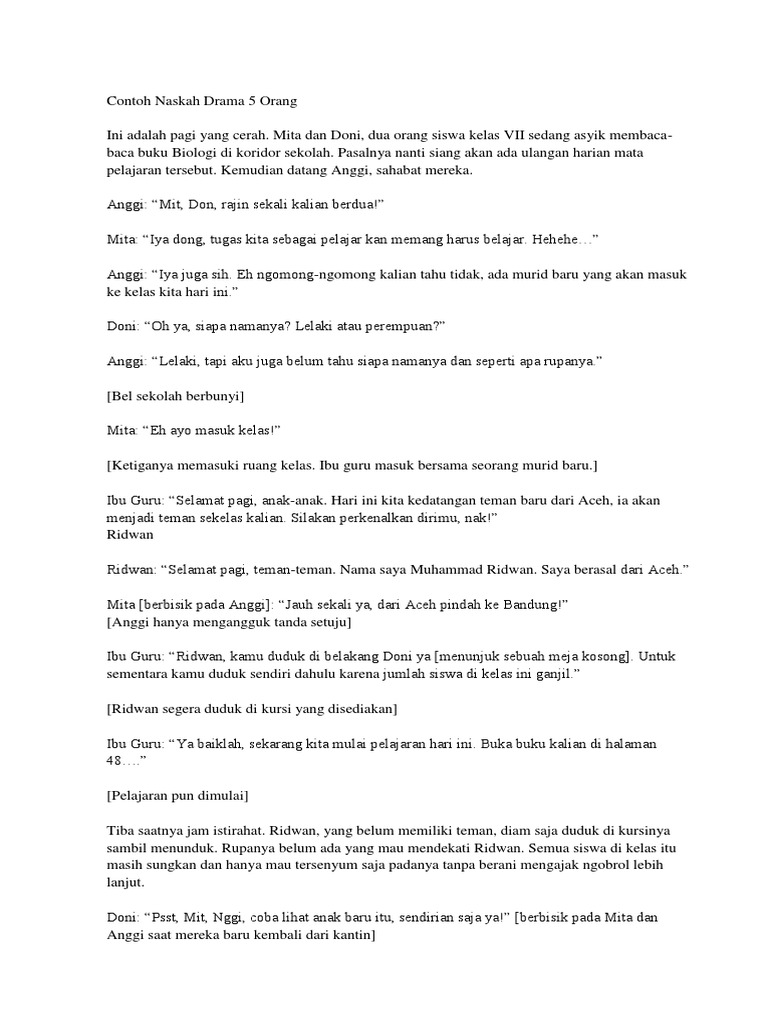 Naskah pidato tentang menuntut ilmu. Contoh teks naskah drama 4 orang wanita tentang persahabatan judul. Namun anda tetap bisa menambahkannya sendiri jika memang dirasa perlubaiklah. Adi banu budi sita dini sinopsis drama suatu kumpulan contoh naskah drama teater 5 orang tentang persahabatan kejujuran mencontek sinopsis. 14 contoh naskah drama. Drama singkat komedi lucu cerita rakyat bahasa jawa lengkap.