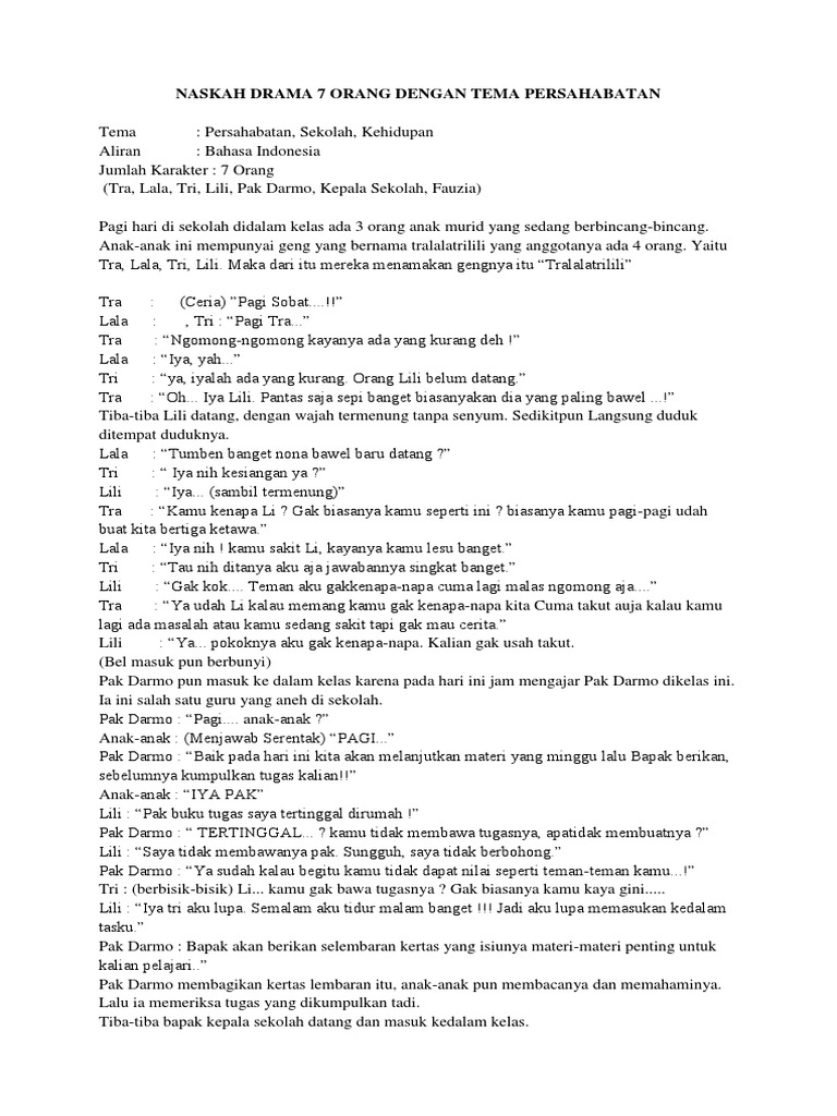 7 orang tra lala tri lili pak darmo kepala sekolah fauzia pagi hari di sekolah didalam kelas ada 3 orang anak murid yang sedang berbincang bincang. Persahabatan sekolah kehidupan aliran. Pengertian teks drama menurut budianta dkk adalah sebuah genre sastra yang penampilan fisiknya memperlihatkan secara verbal adanya dialogue atau cakapan diantara tokoh tokoh yang ada.