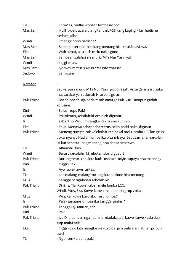 Contoh naskah drama komedi lima orang tentang persahabatan lucu singkat pendek panjang musikal bahasa jawa sepuluh orang 5 6 7 8 9 10 lengkap. Memang pemuda zaman sekarang sudah meninggalkan budayanya sendiri sehingga pemerintah memasukan muatan lokal contohnya bahasa jawa dalam kurikulum pendidikan. Kami dari tim terbeselung akan berbagi kepada kalian contoh teks drama bahasa jawa dengan anggota kelompok 5 orang atau anggota kelompok 7 orang. Wektu iku sawise sekolah sardi ngampiri jono. Sehari hari ana ing sawijining desa ana pemuda kang wus akrab banget yaiku sardi lan jono. Contoh drama bahasa jawa.
