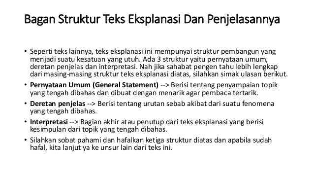 Contoh teks eksplanasi dan strukturnya. Pada artikel ini kita akan coba mengulas teks eksplanasi secara detail. Pembahasannya berkaitan dengan suatu proses kejadian alam sosial budaya ilmu pengetahuan dan lain sebagainya. Contoh teks eksplanasi kompleks. Pernyataan umum pembuka pelangi bahasa inggrisnya rainbow merupakan suatu peristiwa optik atau meterologi berwujud cahaya yang bermacam macam warna paralel satu dengan yang lainnya di langit atau juga media yang lain. Teks eksplanasi lengkap yang memuat pembahasan mengenai pengertian ciri struktur kaidah dan contoh agar lebih mudah memahami pembahasan kali ini. Mulai dari pengertian teks eksplanasi ciri ciri teks eksplanasi dan struktur teks eksplanasi.