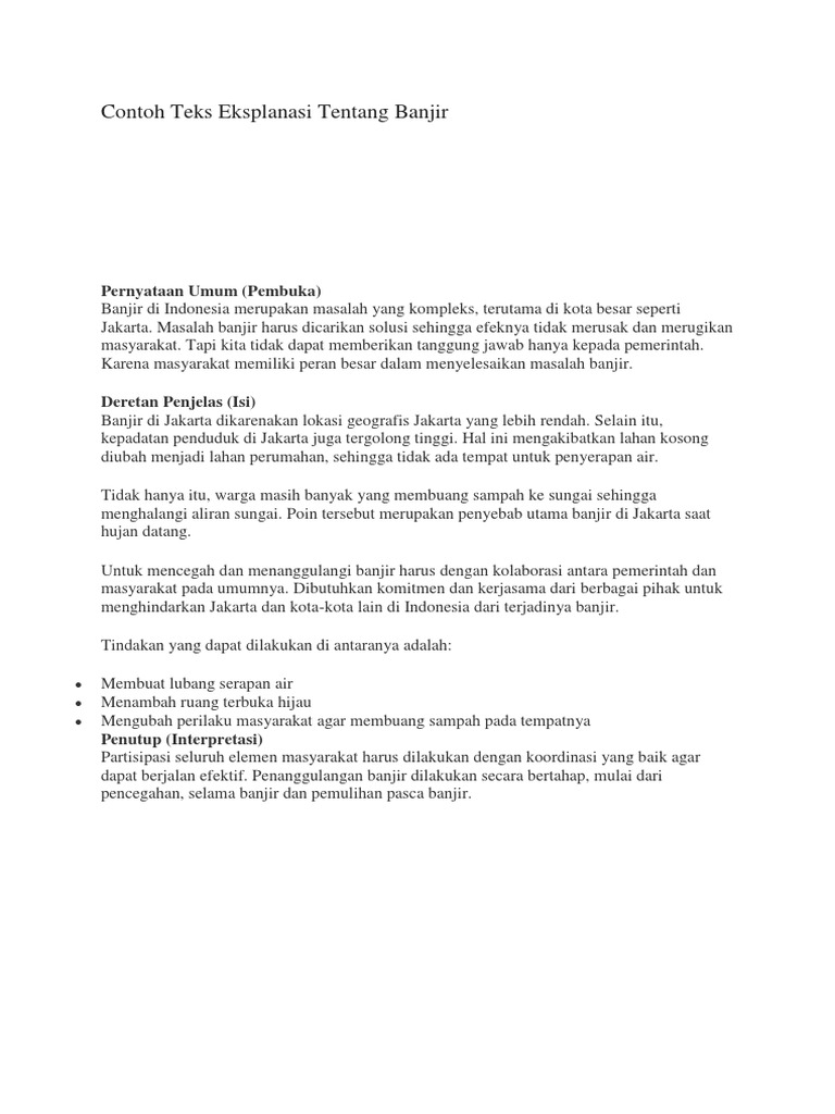Contoh teks eksplanasi tentang banjir. Berikut ini terdapat beberapa contoh teks eksplanasi antara lain sebagai berikut. Contoh teks eksplanasi setelah kita mengetahui masing masing penjelasan mengenai berbagai teks diartikel sebelumnya. Adapun generic structure dari explanation text adalah. Contoh explanation text tentang banjir. Pada struktur umum teks eksplanasi ini berisi berupa penjelasan umum tentang suatu kejadian fenomena alam bencana alam atau kejadian kejadian sosial yang akan menjadi topik pembahasan yaitu berupa pengenalan dari suatu fenomena alam bencana alam atau. Seperti yang telah dibahas pada paragraf sebelumnya explanation text bertujuan untuk menjelaskan peristiwa atau suatu kejadian yang terjadi tujuanya tentu saja untuk memberikan informasi mengenai peristiwa tersebut.