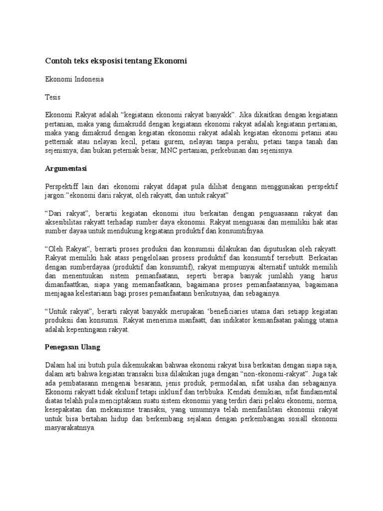 Contoh teks eksposisi tentang ekonomi. Tetapi ironisnya beberapa besar petani terutama beberapa buruh tani kesusahan dalam penuhi keperluan ekonomi. Seperti yang kita ketahui bersama bahwa pengertian teks eksposisi adalah sebuah karangan atau paragraf yang memiliki kandungan berupa informasi atau pengetahuan yang mencoba. Contoh teks eksposisi tentang ekonomi. Setelah mengetahui contoh teks eksposisi tentang politik maka selanjutnya akan diulas mengenai contoh teks eksposisi tentang ekonomi. Secara terminologi teks eksposisi adalah merupakan sebuah teks yang bersifat mengajak dan berisi sejumlah informasi yang ditulis. Pernyataan pendapat tesis semua orang orang indonesia akan tidak makan bila tak ada kesibukan pertanian.