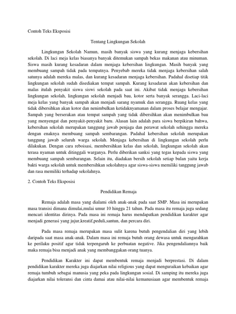 Contoh teks eksposisi tentang lingkungan sekolah. Kabar baiknya yuksinauid telah menyediakan contoh teks eksposisi tentang sekolah lengkap beserta strukturnya. Uraian tersebut berbentuk tulisan yang singkat padat dan jelas agar pembaca akan lebih mudah memahami maksud dari. Tujuannya adalah untuk memaparkan dan menjelaskan sesuatu agar pengetahuan pembaca bertambah. Menganalisis teks eksposisi oleh kelompok 1 melia rahma putri nesha permata rizky ra arni putri rahmaldi wardhatul irany wena mira menjaga kebersihan lingkungan sekolah kebersihan lingkungan sekolah adalah salah satu faktor terpenting untuk menciptakan kenyamanan baik di lingkungan rumah maupun di lingkungan sekitar. Masih membahas seputar serial teks eksposisi dimana tidak jarang guru di sekolah memberikan kita tugas untuk membuat contoh teks eksposisi yang salah satunya membahas mengenai sekolah. Sebisa mungkin kami memahami keinginan kamu sehingga kami hanya memberikan contoh eksposisi.