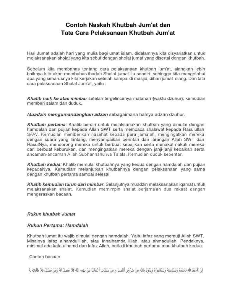 Contoh khutbah jumat pendek nu singkat padat lengkap terbaru berkhutbah dalam menjalankan tata cara peribadahan khususnya yang berlangsung pada sholat jumat itu memang terdapat beberapa kategori yang kiranya penting untuk diketahui. Contoh khutbah jumat singkat padat lengkap hari jumat merupakan hari yang sangat istimewa bagi umat islam. 1 rukun khutbah jumat. Jumat adalah hari yang agung. Selain itu di hari jumat setiap ummat muslim laki laki yang masih memiliki iman di dalam hatinya wajib untuk melaksanakan shalat berjamaah di masjid yang kita.