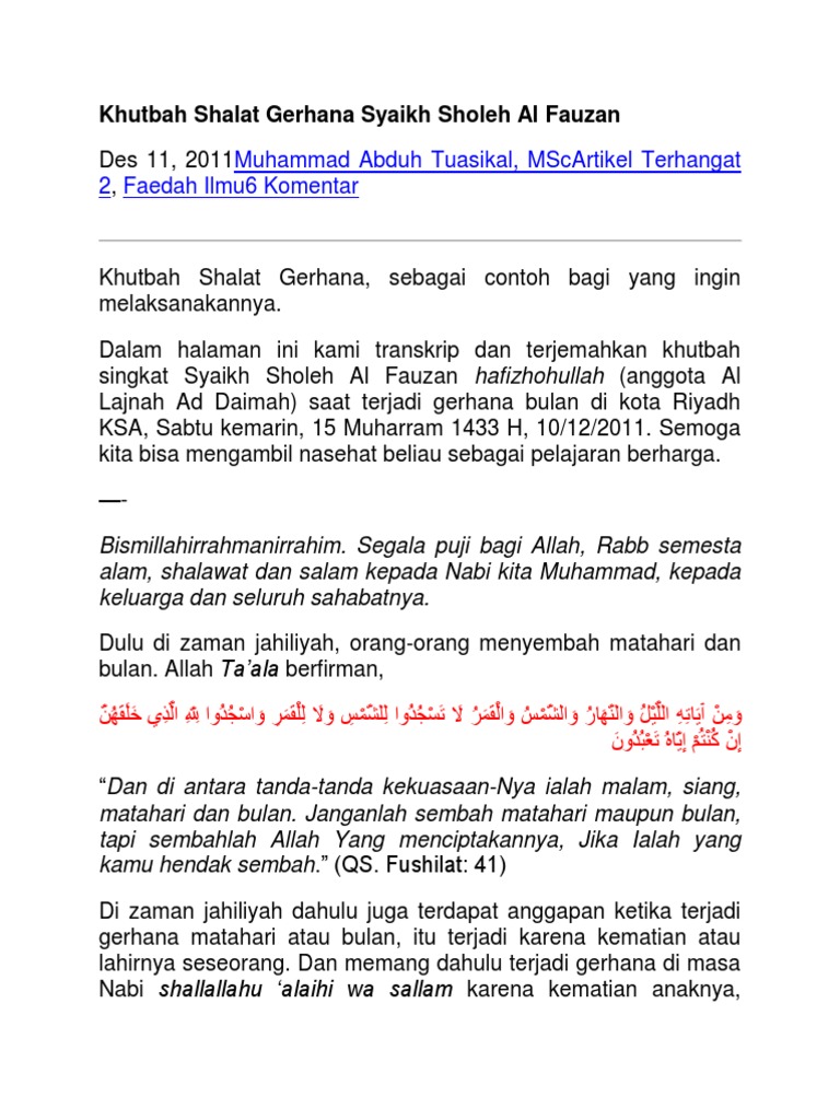 Baik sebelum atau sesudah shalat. Gerhana bulan adalah suatu peristiwa yang menakjubkan kepada seluruh umat manusia kerana secara tiba tiba bulan kehilangan cahayanya. Jamaah shalat gerhana bulan asadakumullah setiap orang di antara kita barangkali sudah mengimani bahwa seluruh keberadaan alam semesta ini diciptakan oleh allah subhânahu wataâlâgunung laut rerumputan binatang udara benda benda langit jin manusia hingga seluruh detail organ dan sel sel di dalamnya tidak luput dari penguasaan dan pengaturan allah. Namun menurut madzhab lainnya berdasarkan dzahir hadis khutbah shalat gerhana hanya satu kali. Apalagi bagi yang mengatakan bahwa shalat gerhana itu dilakukan secara munfarid sendiri. Contoh teks khutbah shalat gerhana matahari contoh teks khutbah shalat gerhana matahari marilah kita sama sama meningkatkan keimanan dan ketaqwaan kita kepada allah swt.