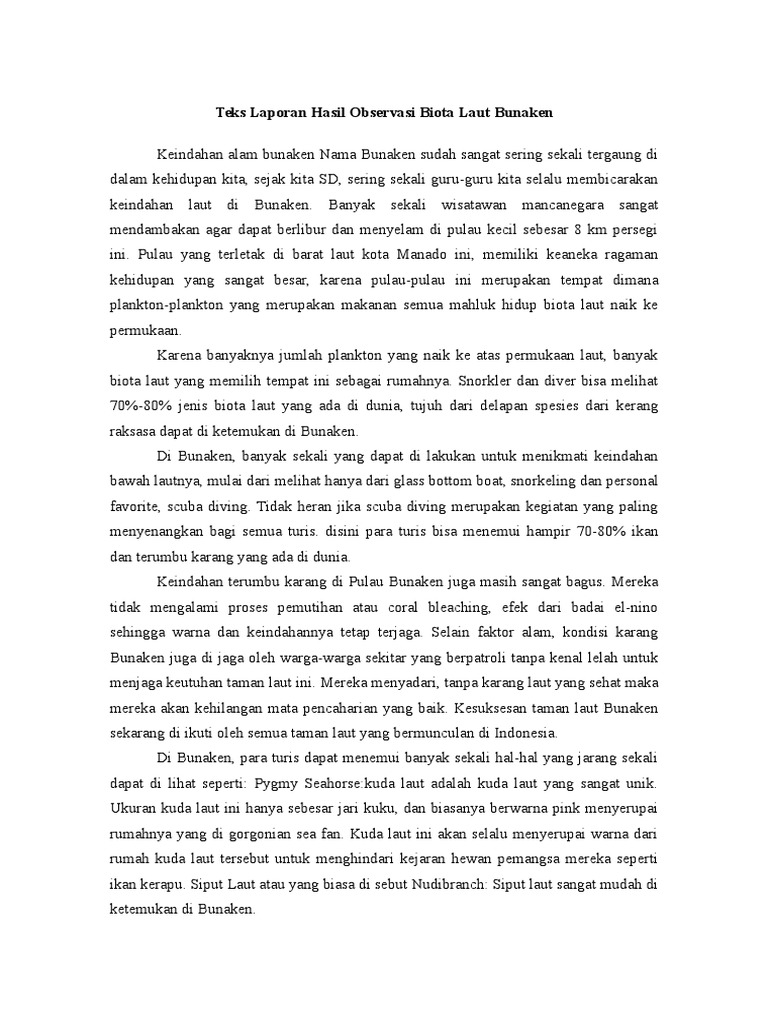 Contoh teks laporan hasil observasi tersaji pada artikel ini. Sedangkan untuk teks hasil observasinya mempunyai pengertian isi teks yang menjelaskan tentang suatu informasi baik itu hewan tanaman fenomena alam hasil karya manusia serta fenomena sosial yang sesuai. Hiu ini disebut hiu paus karena ukuran tubuhnya yang sangat besar dan bentuk kepalanya tumpul mirip paus.