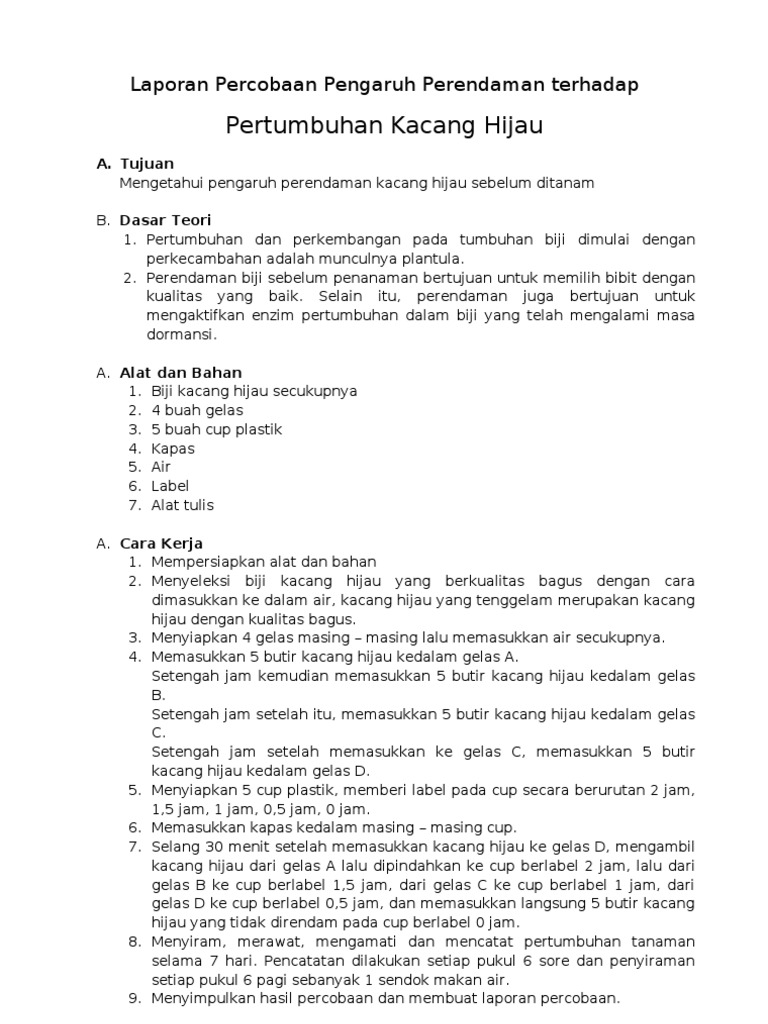Untuk bentuk dan model laporan tersebut dapat dilihat dari contoh teks. Demikian laporan praktikum biologi tentang uji kandungan zat pada makanan. Teks laporan percobaan ialah teks yang isinya paparan mengenai tujuan proses dan hasil dari percobaan. Berikut disajikan contoh teks laporan percobaan berjudul pengaruh cahaya terhadap pertumbuhan kacang hijau yang diunduh dari laman kupdf dengan perubahan seperlunya. Teks laporan percobaan merupakan teks yang menceritakan tentang percobaan yang dilakukan oleh peneliti. Bagi sebagian anak yang melakukan suatu praktek atau melaksanakan suatu kegiatan didalam berbagai hal pasti mengenal istilah teks laporan percobaan.