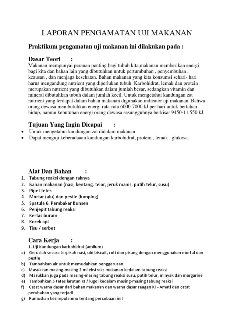 Semoga dapat digunakan sebaik baiknya dan dapat menambah ilmu dan pengetahuan tentang kandungan zat pada makanan. Teks laporan percobaan ini sendiri adalah teks yang isinya paparan mengenai tujuan proses dan hasil dari percobaan. Teks ini biasanya digunakan untuk melakukan percobaan atau eksperimen berupa karya ilmiah laporan praktikum serta laporan uji coba lainnya. Contoh teks laporan percobaan untuk anak anak yang sedang melakukan praktikum berkaitan suatu hal pasti mengenal istilah teks laporan percobaan. Teks laporan percobaan adalah tahap deskriptif suatu proses uji coba penelitian tertentu dalam bentuk laporan agar dapat dipaparkan dan dijelaskan hasil uji penelitiannya. Cara untuk menyusun teks rekaman percobaan sangat penting untuk dipahami oleh seorang pelajar dan peneliti karena mereka akan tentu lebih banyak melakukan percobaan yang.