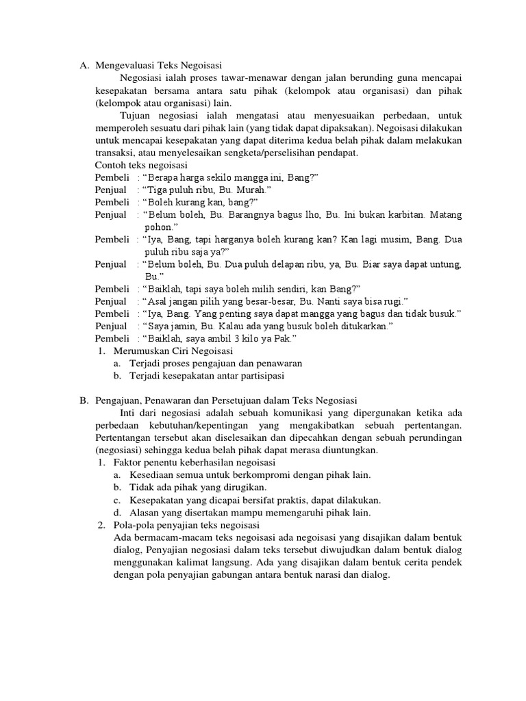 Contoh teks negosiasi. Teks narasi memiliki tujuan untuk memberikan informasi atau menciptakan pengalaman yang berkesan kepada pembaca atau pendengar. Terdiri dari 5 contoh dari beragam persoalan yang berusaha dipecahkan melalui proses negosiasi. Contoh teks negosiasi di bawah ini adalah contoh teks negosiasi yang kami sajikan dalam bentuk percakapandialog antara dua pihak. Contoh teks negosiasi dalam bentuk narasi. Karena tas yang dia miliki sudah rusak maka dari itu dia mendatangi salah satu toko yang terkenal di daerahnya.