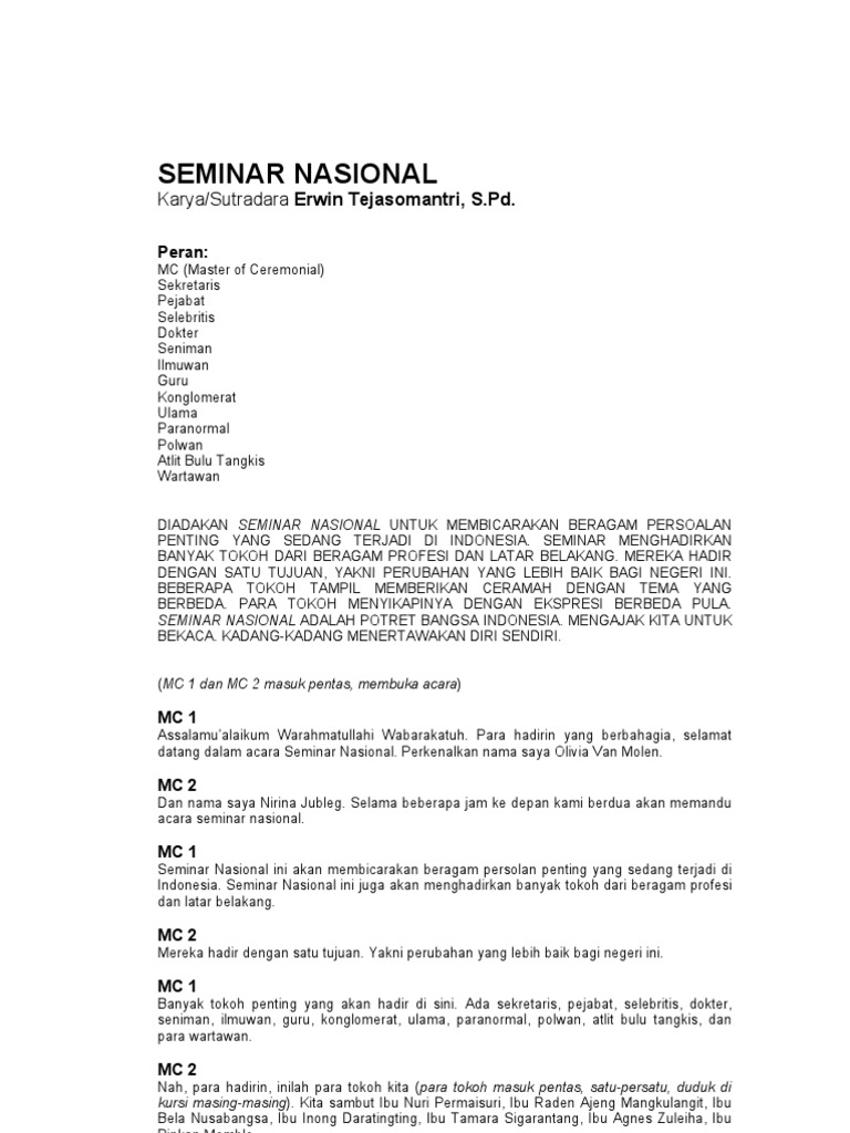 10 oktober 2018 1520 183126 0 1 mohon tunggu. Pada kesempatan kali ini kami akan memberikan contoh lengkap naskah mc pembawa acara untuk seminar nasional yang sudah lengkap bahasa indonesia. Wb salam sejahtera untuk kita semua yang terhormat dekan fakultas keguruan dan ilmu pendidikan universitas pancasakti tegal atau yang mewakili beserta jajarannya yang saya hormati ketua program studi pendidikan matematika universitas pancasakti tegal. Yang terhormat bupati jepara atau yang diwakili kepala dinas pendidikan dan pemuda olahraga. Islami sh msi sebagai narasumber. Bahkan tidak sedikit orang yang mencari contoh teks mc non formal sebagai referensi.
