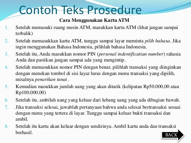Teks prosedur sederhana teks prosedur sederhana yaitu teks yang berisi langkah langkah sederhana yang biasaya hanya 2 4 langkah saja dalam melakukannya contohnya cara login facebook. Contohnya adalah prosedur tentang terkena tilang oleh polisi. Teks prosedur kompleks dapat diartikan sebagai karya tulis yang menunjukkan informasi mengenai langkah atau tahapan yang saling berhubungan untuk menyelesaikan. Struktur teks prosedur ialah teks yang isinya tentang langkah langkah ataupun tahap tahap dalam melakukan suatu hal dari mulai melakukan kegiatan tertentu atau membuat hal tertentu yang di sajikan dengan berurutan. Pengertian tujuan ciri struktur kaidah kebahasaan macam dan contoh teks prosedur. Salah satunya ialah teks prosedur dimana jenis teks ini ialah teks yang nantinya akan membahas maupun menjelaskan tentang langkah langkah pada saat membuat dan melakukan sesuatu.