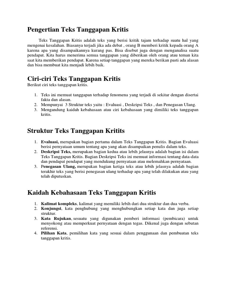 Contoh teks tanggapan kritis apa yang anda ketahui tentang teks tanggapan kritis. Teks tanggapan kritis teks tanggapan kritis merupakan bentuk penyampaian untuk menyampaikan kritik kepada suatu hal. Tentunya ada beberapa jenis dari teks ini dengan maksud dan tujuan yang berbeda. Teks tanggapan adalah jenis teks yang bertujuan untuk menganalisis dan menanggapi sesuatu. Maka dari itu adalah hal yang wajar apabila dua pihak atau lebih memiliki pendapatnya masing masing tentang suatu hal. Salah satunya adalah dengan menggunakan teks tanggapan kritis.